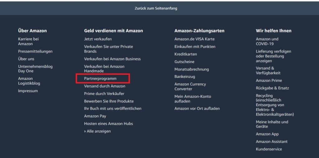 Jeder kann zum Vertriebspartner werden. Es gibt viele Blogger, die ein Affiliate-System haben. Diese Blogger testen Produkte und teilen dann einen Affiliate-Link in der Videobeschreibung oder im Artikel. Der Blogger bekommt dann einen kleine Provision, wenn ein Kunde auf seinen Link klickt und das Produkt kauft. Ebenso können Produkte beispielsweise an Freunde empfohlen werden und mit einem Affiliate Link versehen werden. Melde dich beim Amazon Partnerprogramm an und erstelle deine eigenen Links. Dazu einfach auf der Homepage von Amazon nach ganz unten scrollen und Partnerprogramm anklicken. Siehe Screenshot unten.